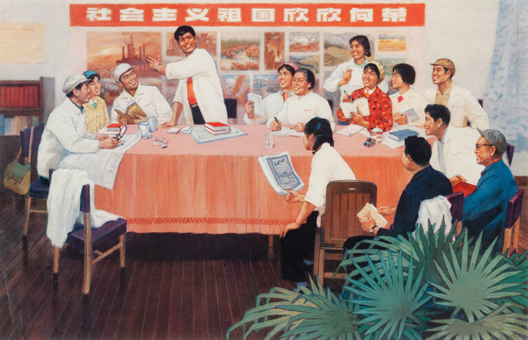 The end of the Cultural Revolution came in 1976 with Mao’s death and the subsequent arrest of the Gang of Four. Afterward, the Chinese Communist Party underwent a period of reform and ended the country’s isolation. Many artists and intellectuals were rehabilitated, and propaganda posters openly criticized the Gang of Four. By 1979 the CCP had adopted a new approach to economic development through its Four Modernizations: in agriculture, industry, national defense, and science/technology. Under the leadership of Deng Xiaoping, visual propaganda promoted the building of China into a modern Socialist country whose economic reforms would make it “rich and strong” (fuqiang). Xu Wenhua, also the painter of Mao’s Children (2004.038.001, designed many political posters during the Four Modernizations period. From 1979–1985 he taught art at the Shanghai Light Industrial Design Institute. In 1986 he moved to New York.