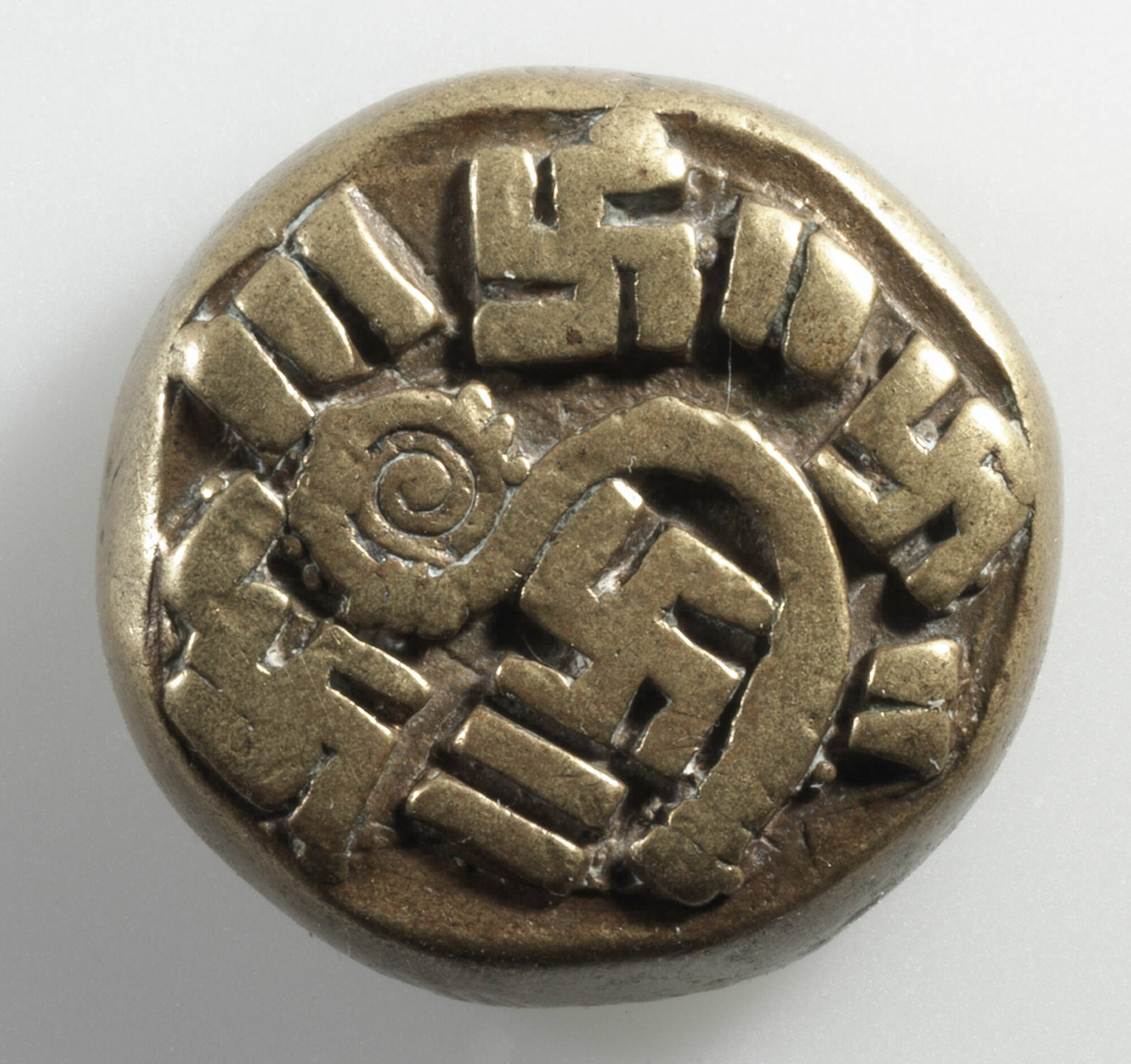 Circular goldweight with with three raised swastika designs, coil motif, and small bands