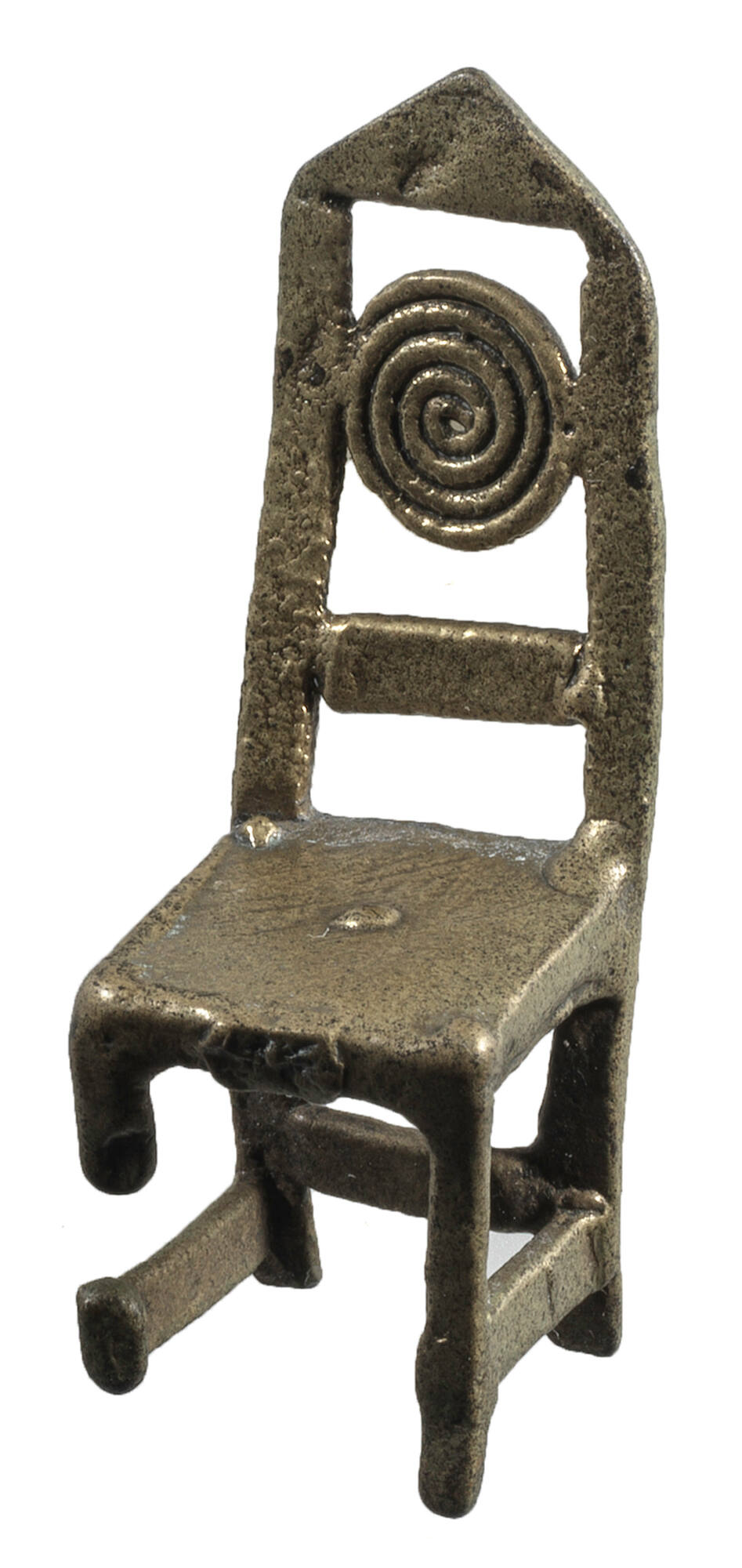 Goldweight in the form of a chair having a coil motif on its back and a triangular top