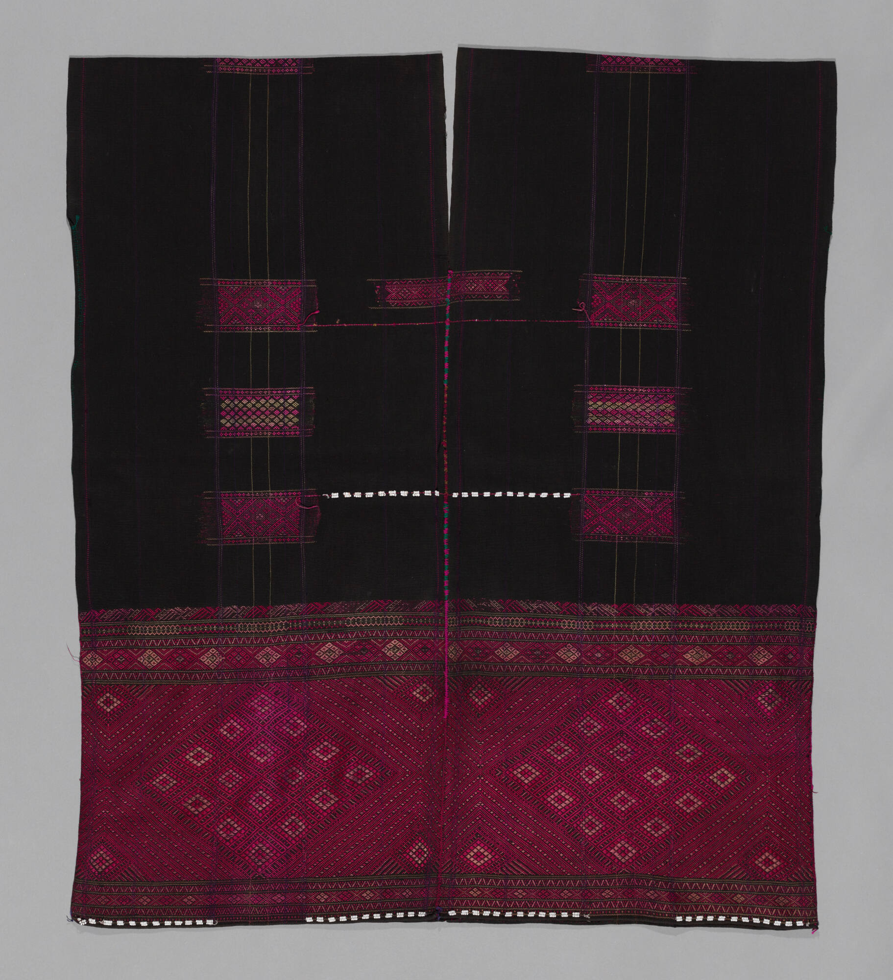 Cotton, silk, and glass beads; warp-faced tabby with supplementary weft patterns