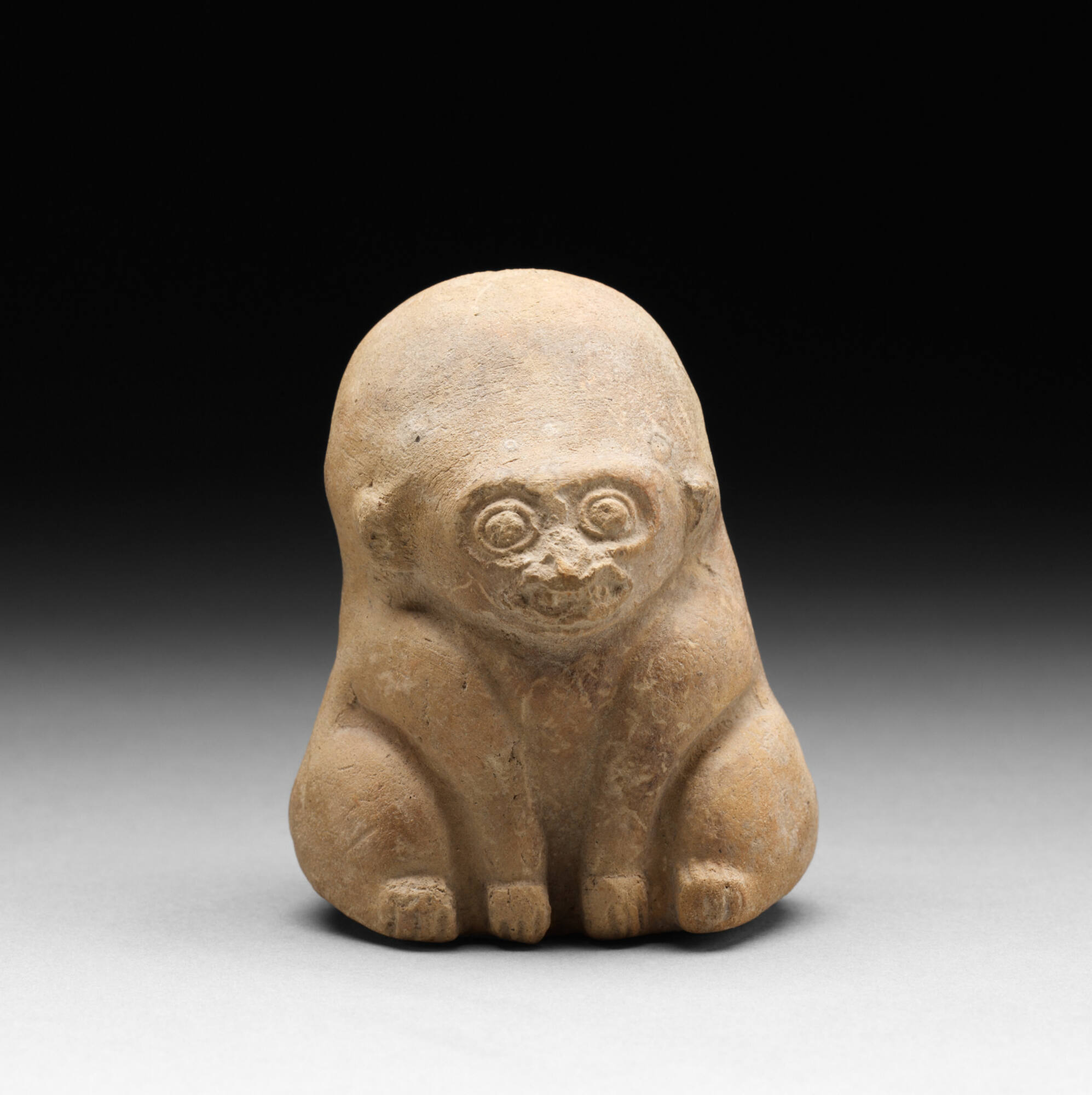 This La Tolita ceramic whistle in the shape of a seated snarling animal — with a large rounded hel(…)