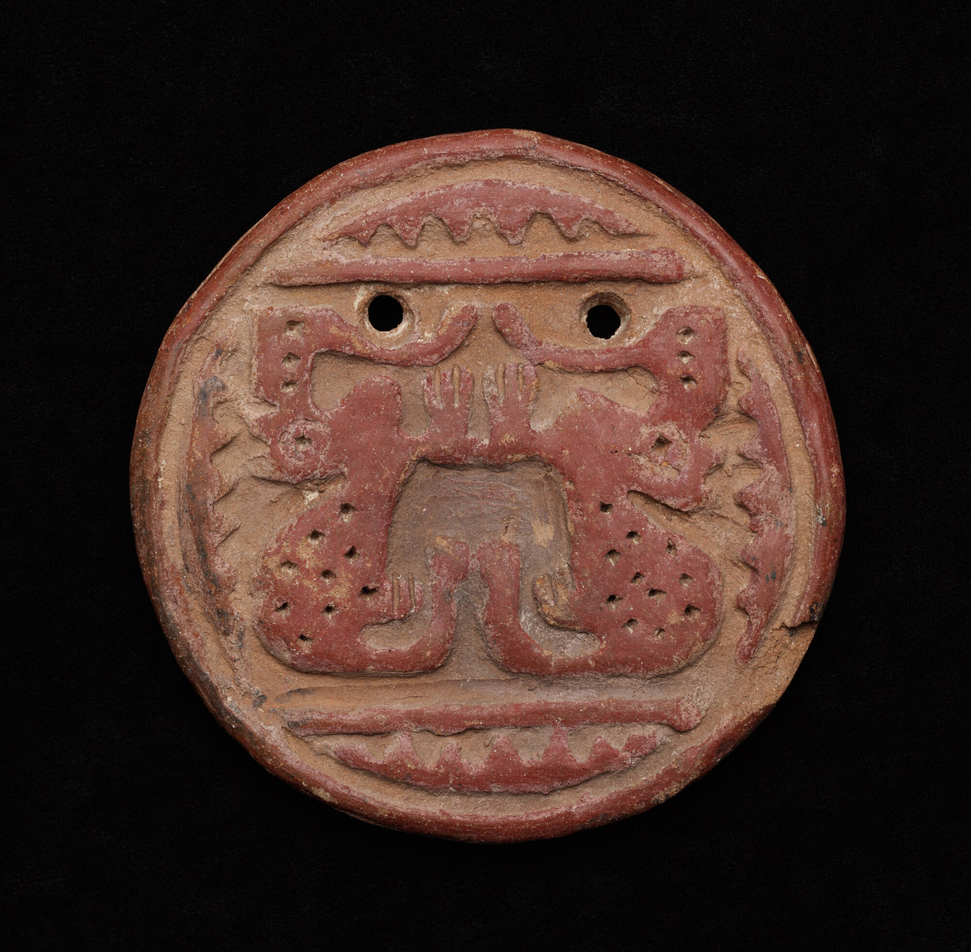 The two holes in this Manteño round ceramic medallion were used for inserting a carrying strap or cord. The medallion has burnished red slip decoration and a raised-relief animal design. The animals have long tails and spotted, rounded bodies with long snouts full of sharp, pointed teeth. Both appear to have long objects (worms or snakes?) dangling from their mouths, and small pointed ears Although it has no handle, this medallion may also have been used as a stamp or seal.
