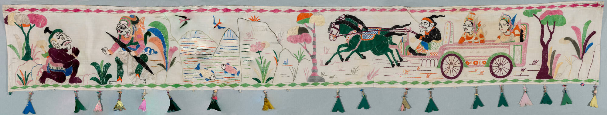 Rectangular hanging (tabing) with scene of Kumbakarna battling the monkey army, from the Ramayana