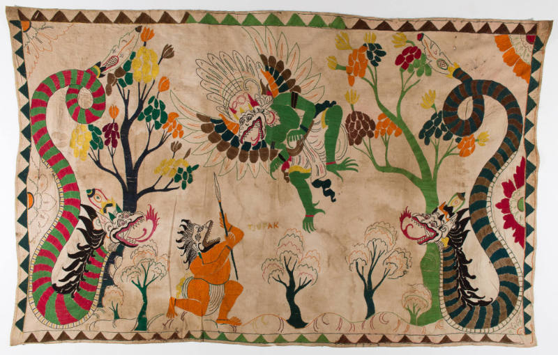 This cloth depicts Arjuna on top of a mountain, having already reached a godly state through prior asceticism. Now he sits, surrounded by four of his seven wives, whose names are stitched above their heads. The scene is framed by two colorful nagas, mythical beasts often associated with earth and water imagery.