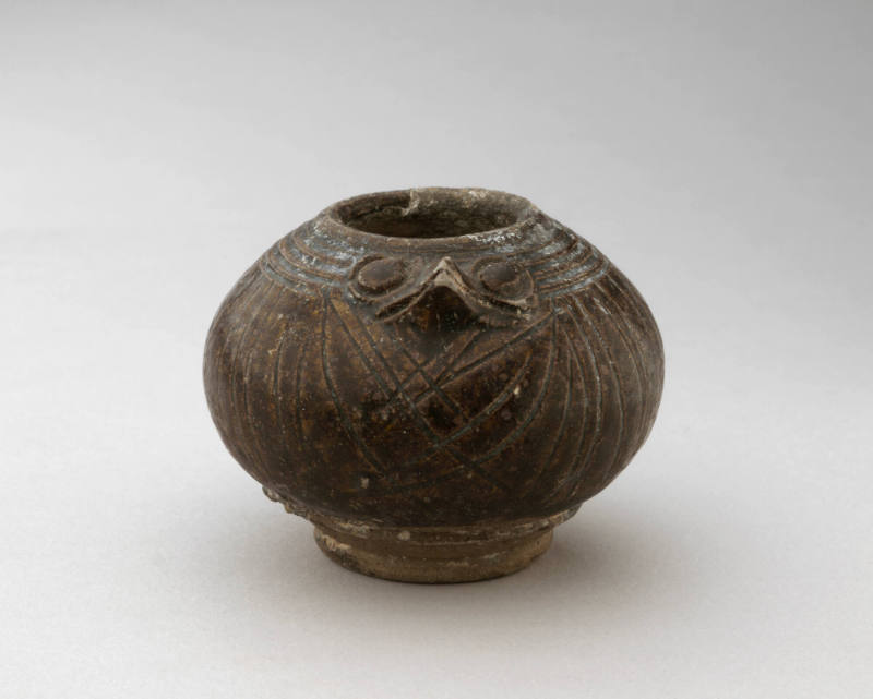 BRIEF DESCRIPTIONThis clay vessel in the shape of an owl was made to guard and protect a tomb during the Han dynasty.WHERE WAS IT MADE?The form of this owl relates to lead-glazed earthenware owl containers excavated from tombs in Henan province, but it is made of ash-glazed stoneware, suggesting that it was made in southern China, perhaps Guangdong province.HOW WAS IT MADE?The owl was made using a combination of different clay hand-building techniques. The glaze on this vessel was created by sifting wood ash over the vessel prior to firing. Wood ash forms a natural glaze, which potters in southeastern China may have begun using as early as the 2nd millennium BC. Notice the use of both incised lines and raised bumps of clay to indicate feathers on the body and head of the owl.HOW WAS IT USED?The imposing presence of the owl could have served to protect the tomb from malevolent spirits or its function might have been as mundane as to deter rodents from devouring the grain or other food offerings meant for the po soul.Tombs serve as a house for the spirit of the deceased. They were filled with objects to provide for the spirit and prevent the spirit from turning into a ghost that would harass the living. Many of the funerary practices of the Han were adopted from the preceding Bronze Age. Han tombs provide us with a wealth of information about daily life and social practices because people from all social classes—not just imperial families—constructed tombs filled with objects from their lives. Imperial tombs were large-scale projects that took many years to build—often, emperors began work on their tombs in the second year of their reigns and reserved one-third of their personal treasury for the construction. More modest tombs consisted of several chambers built into the earth with stone tiles, each filled with objects for entertainment, feasting, housing, and protection. Painted on the walls are scenes from daily life, memorials of the deceased, and funeral processions.WHY DOES IT LOOK LIKE THIS?Notice how alert the owl looks. Owl figures were common in tomb furnishings, because their ability to see in all directions and their nocturnal hunting habits would have made them particularly effective at watching over a dark tomb. Bronze containers in the form of a pair of owls standing back to back, used for storing liquid offerings, were a standard type in the Shang dynasty. Many other examples of ceramic containers in the form of owls are known.