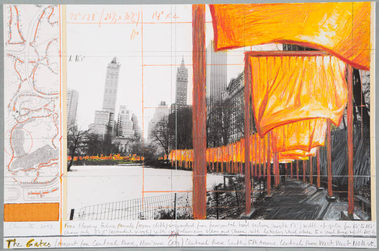 Pencil, enamel paint, photograph by Wolfgang Volz, wax crayon, map, fabric sample, and tape