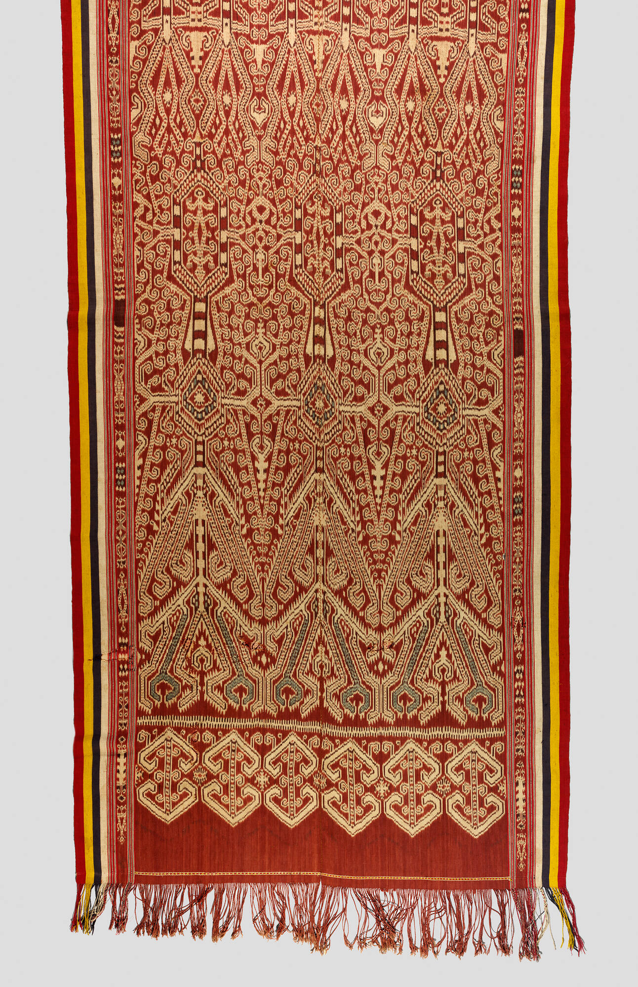 Cloths such as this play an important role in Iban ceremonies. Before the practice was abandoned in the early twentieth century, Iban men were judged by their prowess in head-hunting. The work of women was to weave pua that would be used to mark out the ritual area for head-hunting ceremonies, thus their practice was referred to as the “warpath of women.” Great ability on the part of the women who made these cloths was required because of the difficulty in obtaining the brick red dye and the skill required to make a warp ikat.The weavers of these cloths have described how some designs might appear to them in dreams while others would be passed down through older generations of women. Some motifs are considered so powerful that a woman might not dare to weave them until she has built up sufficient skill and confidence.