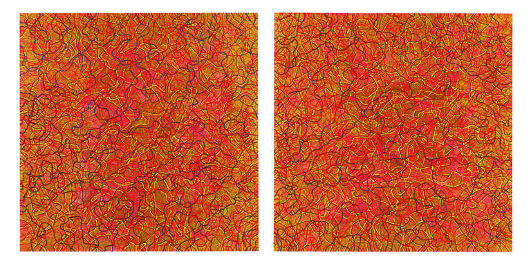 Oil paint and glitter on canvas, mounted on plywood panels