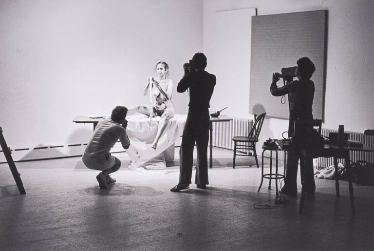 Carolee Schneemann first performed “Interior Scroll” in East Hampton, New York, in August 1975. She entered the performance space wrapped in a white sheet and carrying a bucket of paint and brushes. After undressing, she ritualistically painted her body and read from her book Cezanne, She Was A Great Painter. Schneemann then slowly extracted a scroll from her vagina and read the text below, an excerpt from her Super 8 film “Kitch’s Last Meal.” The thirteen sequential photographs in this portfolio record her historic performance. “Interior Scroll” was performed a second and last time at the Telluride Film Festival, Colorado, in 1977.“I thought of the vagina in many ways—physically, conceptually: as a sculptural form, and architectural referent, the source of sacred knowledge; ecstasy, birth passage, transformation. I saw the vagina as a translucent chamber of which the serpent was an outward model: enlivened by its passage from the visible to the invisible, a spiraled coil ringed with the shape of desire and generative mysteries, attributes of both female and male sexual powers. This source of ‘interior knowledge’ would be symbolized as the primary index unifying spirit and flesh in Goddess worship.” —Carolee Schneemann, 1975Following is the text that Schneemann read from the scroll during her performance:I met a happy mana structuralist filmmaker—but don’t call me thatit’s something else I do—he said we are fond of youyou are charmingbut don’t ask usto look at your filmswe cannotthere are certain filmswe cannot look atthe personal clutterthe persistence of feelingsthe hand-touch sensibilitythe diaristic indulgencethe painterly messthe dense gestaltthe primitive techniques(I don’t take the adviceof men who only talk tothemselves)PAY ATTENTION TO CRITICALAND PRACTICAL FILM LANGUAGEIT EXISTS FOR AND IN ONLYONE GENDEReven if you are older than meyou are a monster I spawnedyou have slithered outof the excesses and vitalityof the sixties……..he said you can do as I dotake one clear processfollow its strictestimplications intellectuallyestablish a system ofpermutations establishtheir visual set……..I said my film is concernedwith DIET AND DIGESTIONvery well he said thenwhy the train?the train is DEATH as thereis die in diet and di indigestionthen you are back to metaphorsand meaningsmy work has no meaning beyondthe logic of its systemsI have done away withemotion intuition inspiration—those aggrandized habits whichset artists apart fromordinary people—thoseunclear tendencies whichare inflicted upon viewers……..it’s true I said when I watchyour films my mind wandersfreely……………..during the half hour ofpulsing dots I compose lettersdream of my loverwrite a grocery listrummage in the trunkfor a missing sweaterplan the drainage pipes forthe root cellar………..it is pleasant not to bemanipulatedhe protestedyou are unable to appreciatethe system the gridthe numerical rationalproceduresthe Pythagorean cues—I saw my failings were worthyof dismissal I’d be buriedalive my works lost………he said we can be friendsequally tho we are not artistsequally I said we cannotbe friends equally and wecannot be artists equallyhe told me he had lived witha “sculptress” I asked doesthat make me a “film-makeress”?“Oh no,” he said. “We think of youas a dancer.”
