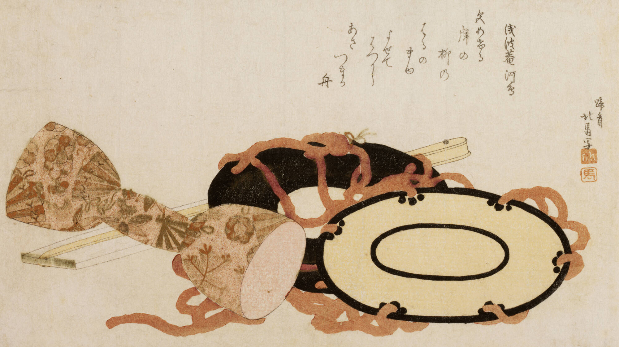 Iro mekeru Coming into color Kishi no yanagi no The willows on the shore Haru no mayu With spring-like, arching eyebrows Yosete hazukashi Drawing close coyly Asazuma ga fune The boats of Asazuma —Sempaan KawadoriThe image and poem combine to refer to the tradition of prostitutes who plied their trade on the waters of Lake Biwa, wearing male kimono, singing and playing music like shirabyoshi dancers. This theme of the original “water-trade” prostitute became politically charged in the Tokugawa Period (1600–1868) when the independent painter Hanabusa Itcho (1652–1724) created a satirical portrait of one of the shogun’s mistresses in the guise of such a woman, for which he was exiled from Edo for over ten years. As a result, the image of the water prostitute became iconic, and Hokuba needs only hint at it here for recognition. The poem makes this connection explicit, however, by overlaying natural spring imagery with eroticism. Iro mekerucan mean to achieve a fullness of color in the nature cycle, or to be amorous, while “willow” refers to a slender, young beauty. Mayucan means “eye-brow,” or the flap of a courtier’s headgear (eboshi) such as the shirabyoshi dancers wore. Asazuma (literally “morning wife”) was the name of a harbor on Lake Biwa, not far from Kyoto, where the boat-riding prostitutes plied their daytime trade. The image reinforces this with the shirabyoshi’s colorful drum and fan, the very dishevelment of which seems to have erotic overtones.