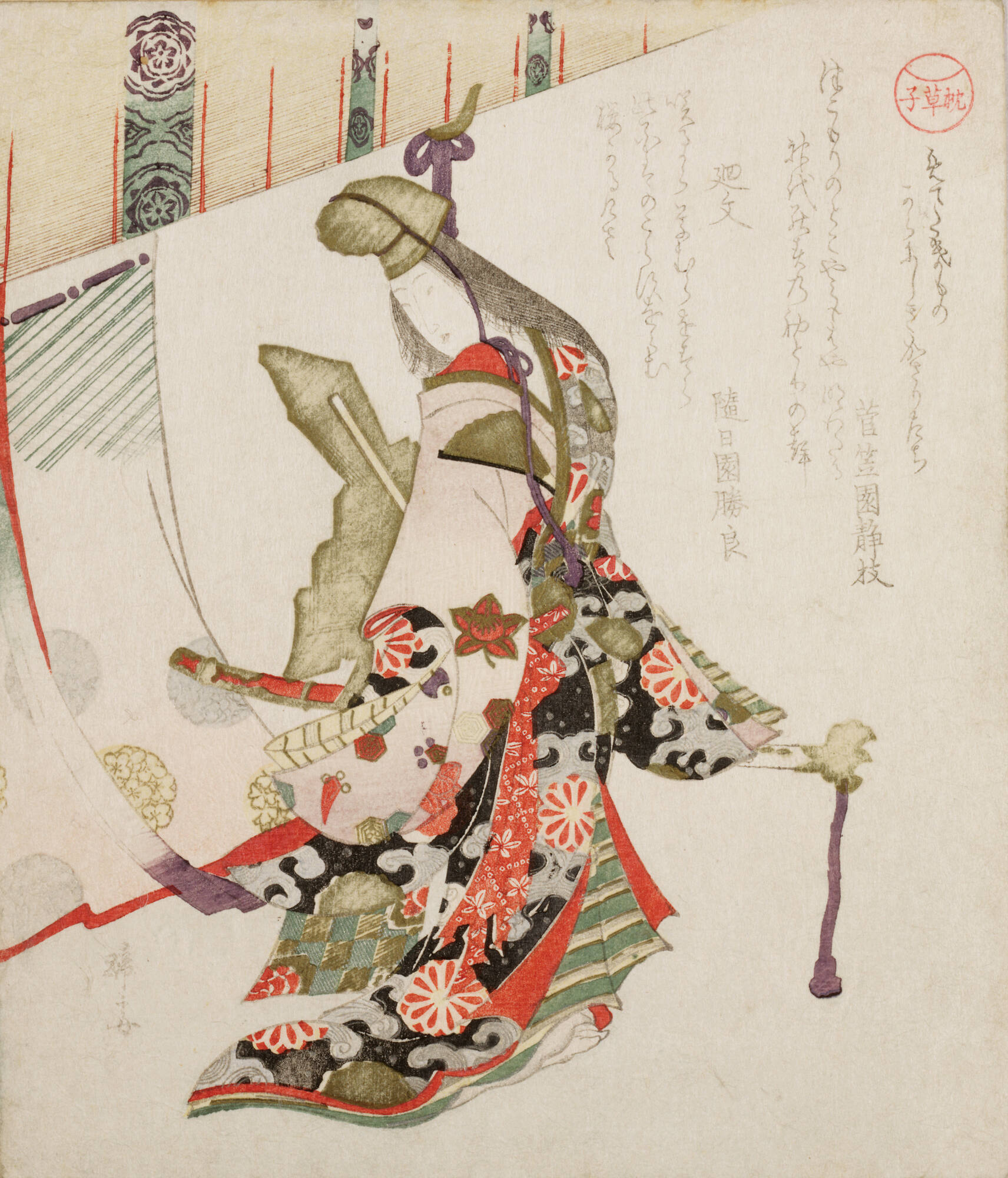 Tsugomori no Tokoyami mo haya Akewataru Kamiyo no haru no Hatsu tori no koe Dawn breaks and quickly spreads Over that eternal darkness Of the last night of the year With the first rooster’s cry In the spring of the Gods —Kanryu ¯en Shizue Sakeru kara Kusa mura wo sura Kono hana wa Nokorazu oramu Sakura karu kesa Since they’ve bloomed If you go to the grass village You’ll find that the plum blossoms No longer remain— Now we hunt for cherries this morning —Zuinichien Katsuyoshi The Pillow Book was a miscellany written at the end of the tenth century by the court lady Sei Shonagon. The work scatters thematic lists among its short, autobiographical narratives, reflecting its author’s tastes and sensibilities. Others from this set include entries under lists like “things that make the heart beat faster” or “things that arouse memories of the past.” In the present example, the list of “splendid things” includes, in addition to the two in the title, the wood grain of Buddhist statues and long wisteria branches twined around pine trees. The title itself seems to provide the seeds for the image, with the beautiful woman wearing the costume of a Shirabyo ¯shi dancer, including richly colored and layered silk brocade and carrying a sword with a fancy handle and scabbard. Shirabyo ¯shi dancers dressed like men for their performances, and were frequently associated with eroticism and prostitution, but the shinto ¯ exorcising wand (gohei) tucked into her sash indicate the dancer’s ritual functions. The first poem, which suggests the primordial scene in which the Sun Goddess is drawn from her cave by music, laughter, and bawdy dance, provides some connection to the theme of the dancer. The second poem is a palindrome (kaibun), reading exactly the same from back to front in its original inscription, an overt cleverness that leads to somewhat forced wording. Palindromes were popular in New Year verse, perhaps for what they suggest about order and repetition.