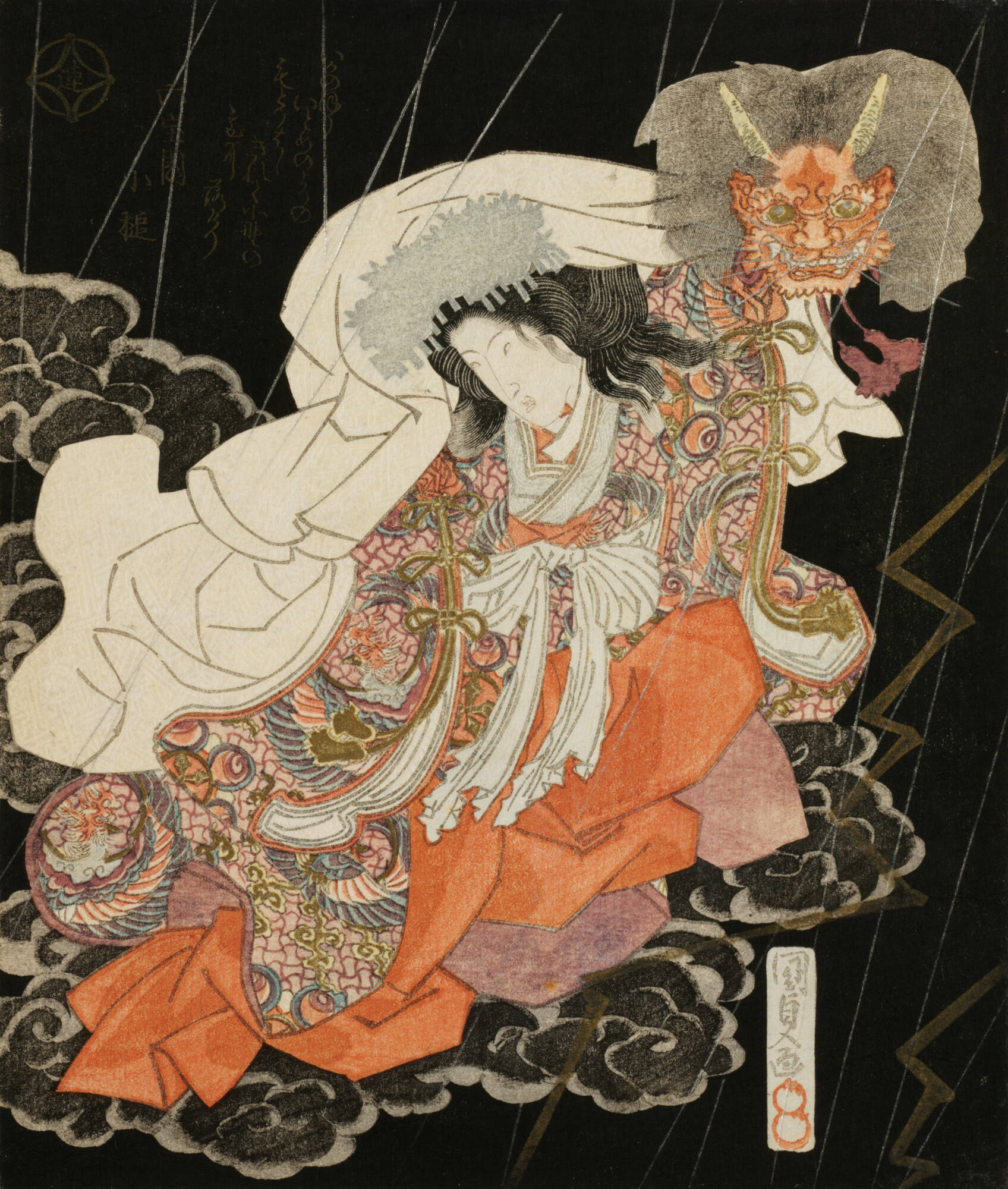 Ikanobori Itome no yori no Modoribashi Kirete Kitano no Miyani ochikeri How it climbs! The kite Its string drawn towards The “Bridge of Returning” Was cut and came to fall In the Shrine of Kitano —Roppo ¯en KozuchiThis print is the top part of a vertical diptych, the lower half of which depicts Ichikawa Danju-ro-VII as Watanabe Tsuna, standing on the roof of the Kitano Shrine. Here, Segawa Kikunojo-as the beautiful woman/demonic force, rises into the sky on a thundercloud, holding a fierce demon mask, wonderfully printed with gleaming metallic pigments for its eyes. The accompanying poem is full of puns, comparing the fate of a kite to that of Tsuna, who had encountered a beautiful woman walking alone one night, and sought to protect her. Seeing her true reflection in the water as he crosses Modoribashi Bridge, however, he realizes she is a demon in disguise, and after some kabuki-style repartee, grapples with it, cutting off its arm. In the traditional version of the story, the demon later returns in disguise as Tsuna’s childhood nurse, to gain entrance to his home and retrieve the severed arm, flying off into the sky with it. The demon’s flight suggests kites, often decorated with supernatural images, and customarily flown on the first days of the New Year. The traditional term for kite, ikanobori, is homophonous with “How it climbs!” thus referencing the shocking upward movement of the demon in the story. Modoribashi, the name of a bridge, as well as of the kabuki play based on this story, is literally “the bridge of returning,” but hints at Tsuna’s guiding the woman home, while hashi has the additional meanings of an edge, extremity or side.