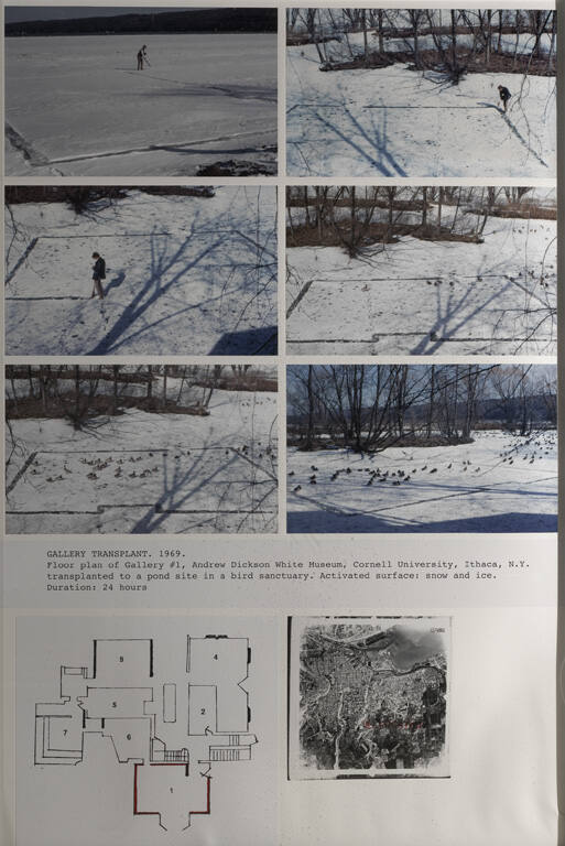 Photodocumentation: color photographs, hand-stamped aerial map, hand-marked photographic floor plan, and text mounted on board (exhibition print)Floor plan of Gallery #1, Andrew Dickson White Museum, Cornell University, Ithaca, NY, transplanted to a pond site in a bird sanctuary.Activated surface: snow and ice. Duration: 24 hours.