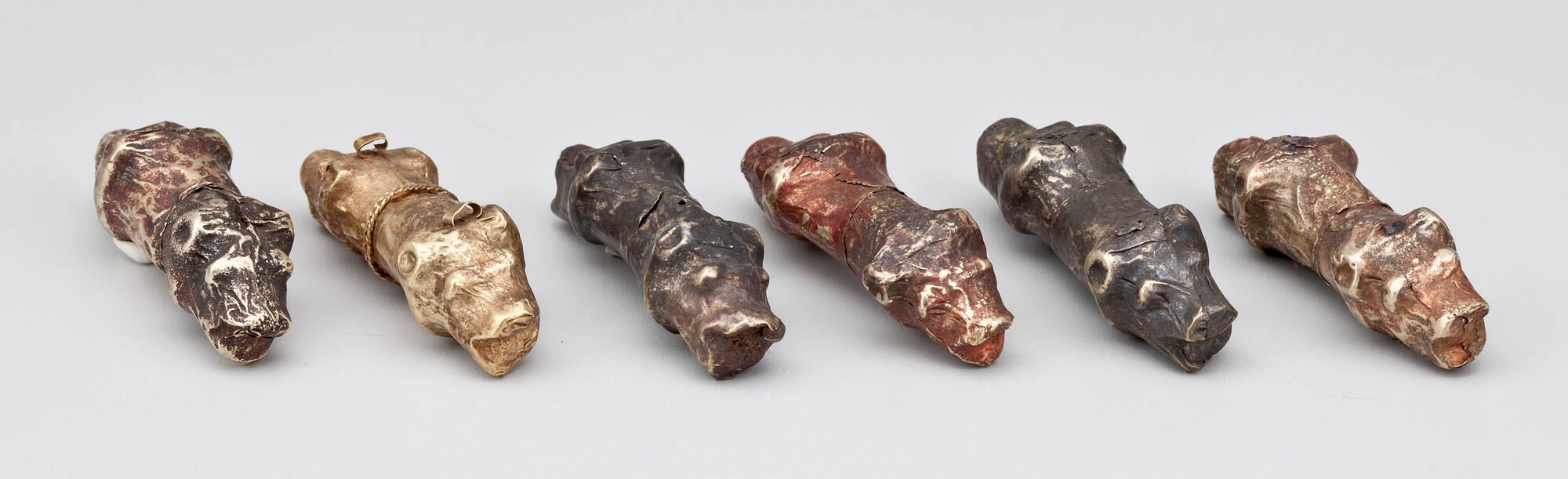 Six hollow beads in the form of two addorsed feline heads, plus one fragmentary head of another feline