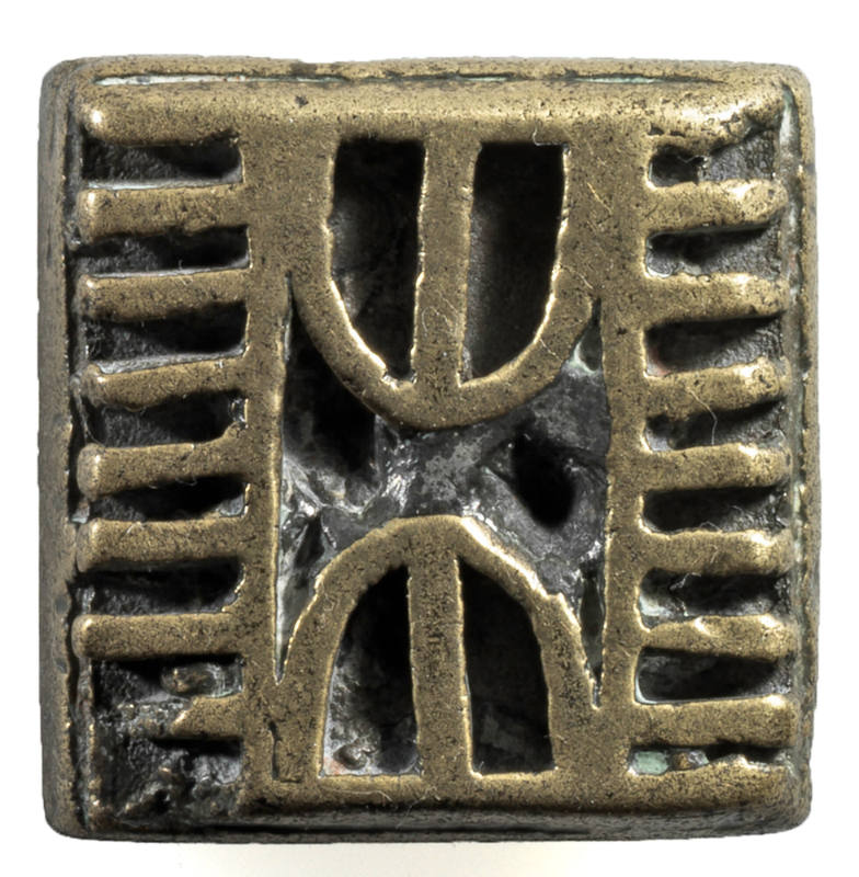 Square goldweight with central motif of half-ovals with radii, and two borders of repeated lines