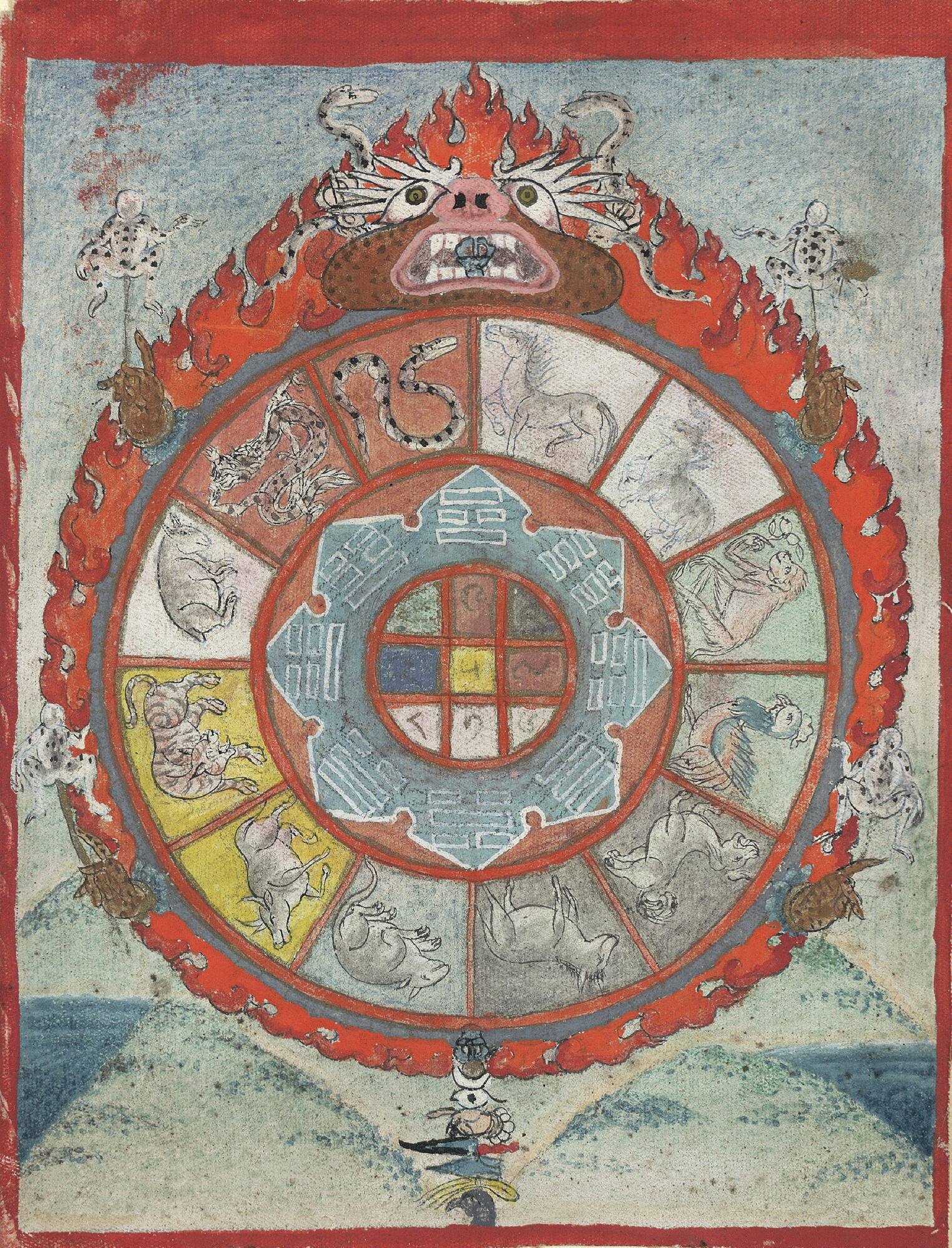 This diagram shows Yama , Lord of Death, holding an astrological wheel within a ring of fire. Tibetans followed the same system for reckoning time as the Chinese did, that is based on twelve-year cycles within sixty-year cycles. An animal represents each year within a twelve-year cycle. Clcokwise from the top the astrological wheel shows all twelve zodiac animals: horse, ram, monkey, cock, dog, pig, rat, ox, tiger, hare, dragon and snake. In the center a blue lotus blossom, each of whose petals contains one of the eight Daoist trigrams. Its center is divided into nine compartments, each housing a sanskrit number. Colors signify the five elements: green for wood, red for fire, yellow representing earth, white symbolizing metal and blue for water. Such diagrams would serve as aids to divination.