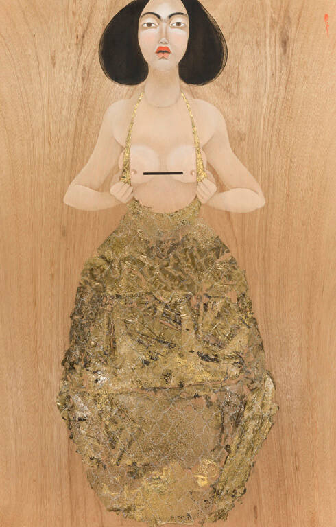 Hayv Kahraman creates figurative paintings that depict women, alone or in groups marked by similarities, with glowing pale skin and inky black hair, mashing up a variety of styles. Against the background of her own story of migration, having spent her childhood in war-torn Iraq and her adolescence in Sweden as a refugee, Kahraman’s paintings confront themes of involuntary exile and violence, specifically against women. The figure that she paints over and over again represents herself, as she grapples with her own history of displacement and trauma. With paintings like Boob Gold, Kahraman situates her work within a complicated discourse about the female body as object and subject, engaging issues of dignity versus victimhood. Exposing her breasts while refusing to lower her gaze, the woman in Kahraman’s painting engages in an act of self-empowerment to address a systemic problem. “How can situations of suffering and violence be portrayed,” anthropologist Miriam Ticktin has asked, “without erasing the dignity of those who suffer, without representing them as victims, as uncivilized and unable to care for themselves.” (“how the light gets in,” curated by Andrea Inselmann and presented at the Johnson Museum September 7-December 8, 2019)