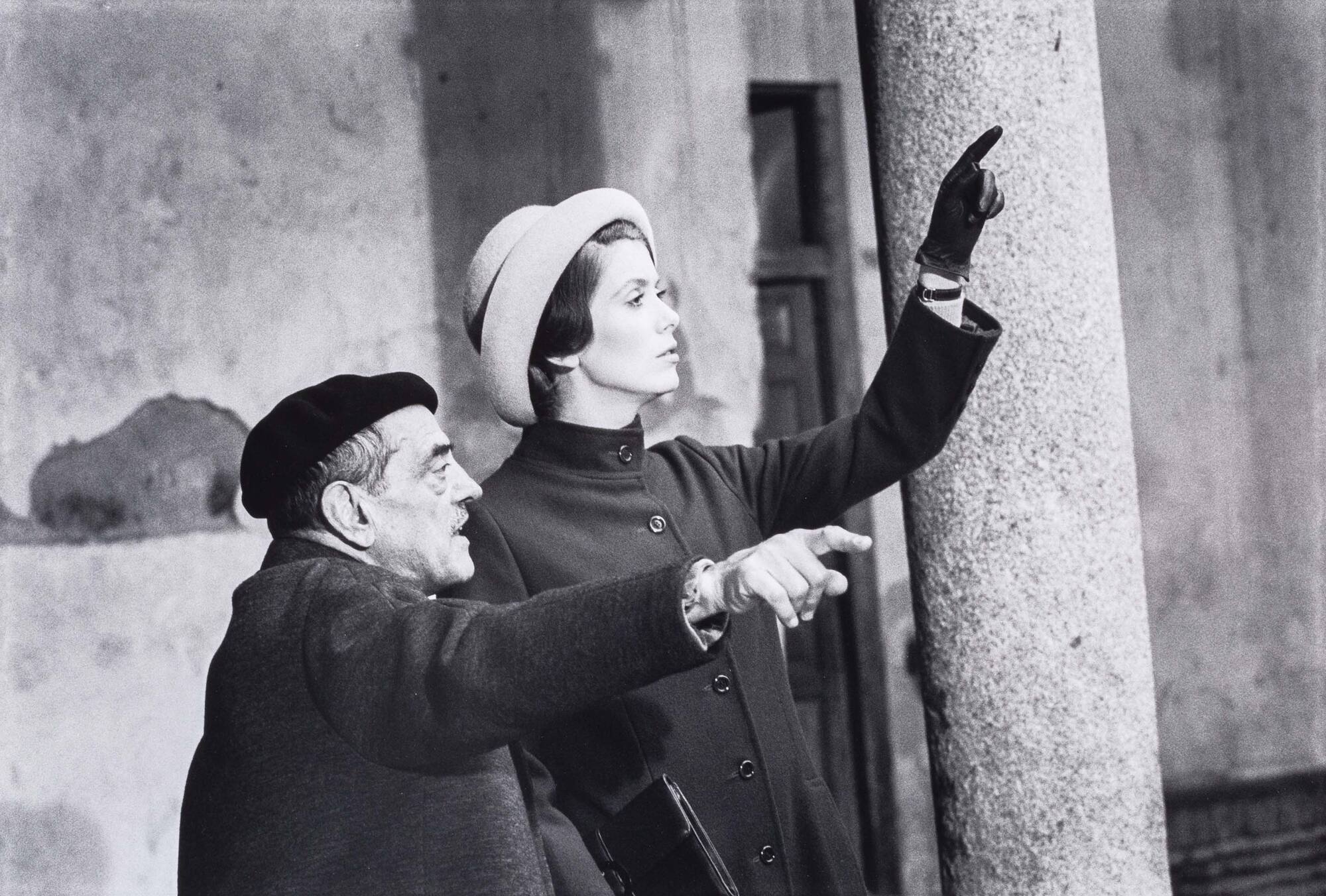 Luis Buñel and Catherine Deneuve pointing at something on the set of Tristana, from the series Luis Bruñel