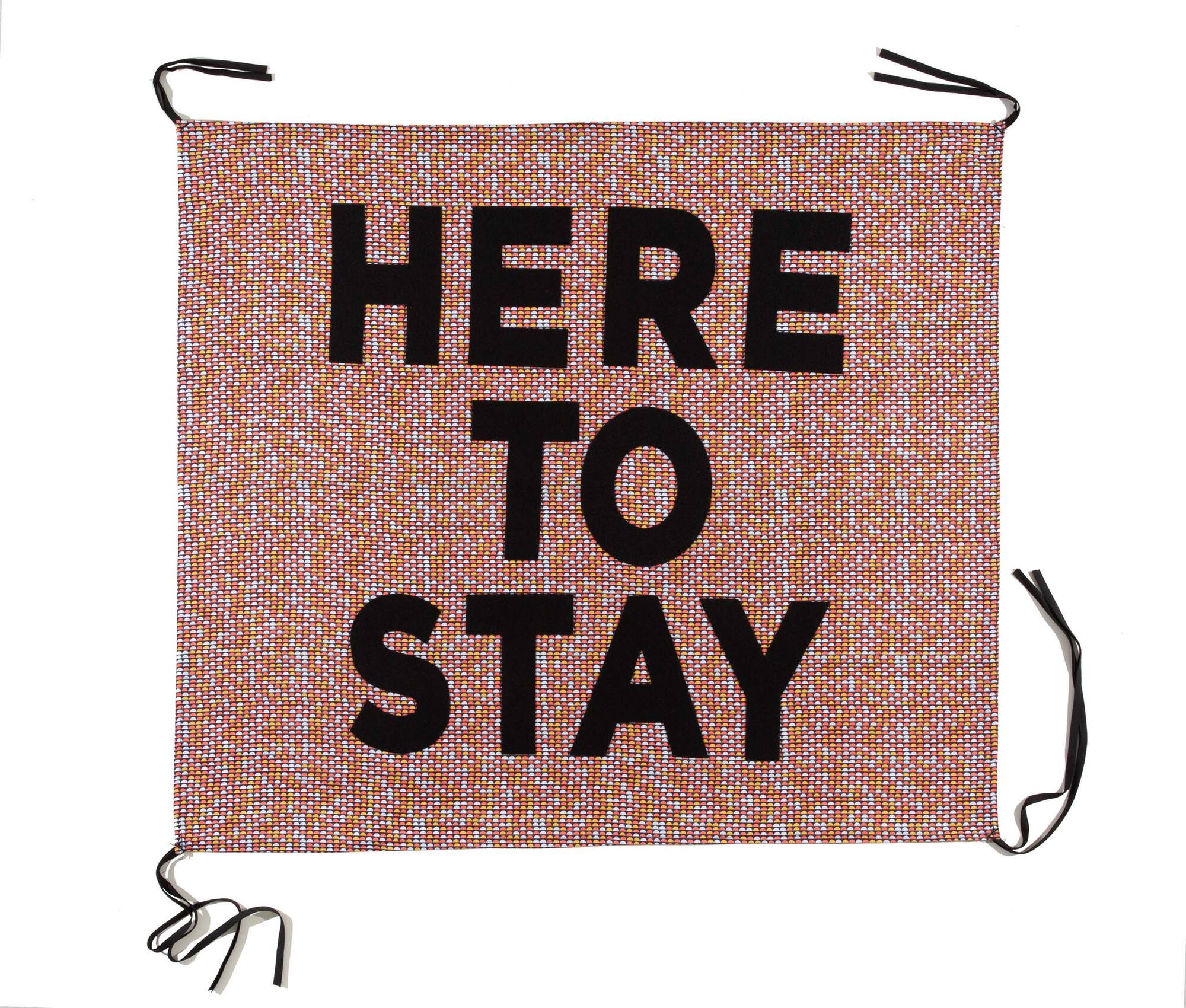 Here to Stay, from the artist’s Protest Banner Lending Library (2016–ongoing), created by an anonymous workshop participant during the Johnson Museum exhibition, how the light gets in (September 7–December 8, 2019)