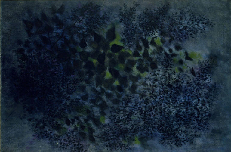 Hanging scroll: ink and color on paper, overlaid with burned paper; and fragment of an ink rubbing