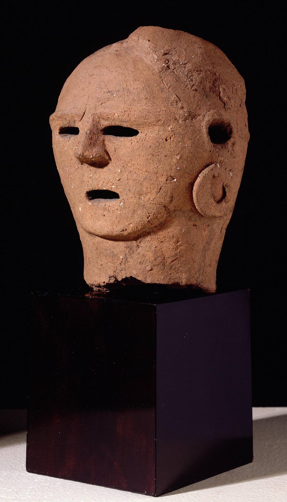 Kofun were large, mounded tombs that, seen from above, appear in the form of a circle joined to a rectangle, suggesting the shape of the modern keyhole. On and around the tomb mound, hundreds of clay cylinders topped with sculpted images were inserted. The function of these clay cylinders, or haniwa, is still debated, but generally it is believed they were attempts to console the dead by providing a reassuring environment for their spirits, who continued to dwell in the sacred precincts of the tomb. Hence haniwa drew their subject matter from the familiar world of the living: animals, houses, weapons, ritual objects, and human figures. Although this piece is missing the rest of the body and the cylinder base, it is nonetheless a vivid image of a haniwa head. With great boldness and simplicity, the sculptor has conveyed the sense of a human caught in a moment of great seriousness. Despite the roughness of the clay and the quickness of handling, the image seems remarkably sophisticated and appealing. (From “A Handbook of the Collection: Herbert F. Johnson Museum of Art,” 1998)