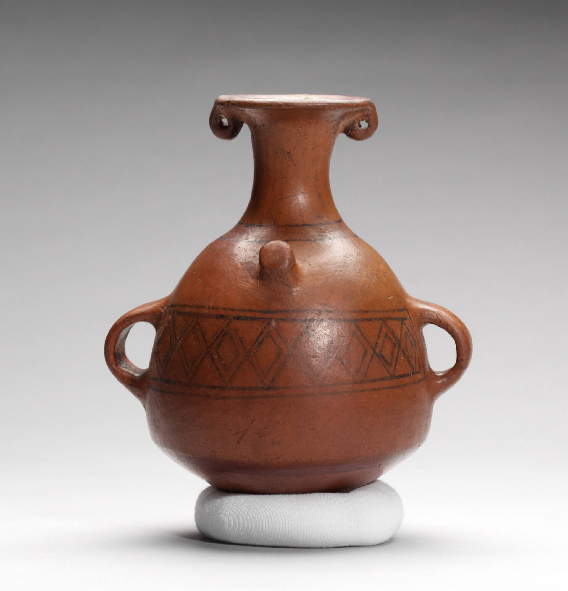 This small Inca aryballoid jar – or urpu – has a pointed base, an outflaring rim at the top of the narrow spout, and two sets of handles, one small set just below rim, and the second set of larger handles midway down vessel body. The vessel also has a small clay projection on the center front. The vessel has a band of Cusco-Inca style geometric diamond designs in thin black lines painted on red slip, and wider bands of brown around the interior of the rim and below the carination. This vessel shape is characteristic of the Inca (Inka), and is diagnostic for the Late Horizon; “urpus” were made in a wide range of sizes. This most quintessentially Inca vessel form was often copied by people who had been conquered by the Incas, who employed their own local ceramic traditions during manufacturing and when applying surface decoration. As in this example, Cusco-Inca urpus are generally smooth-surfaced redwares with fine linear designs, while Provincial Inca vessels exhibit a wider range of surface texture and color treatments.