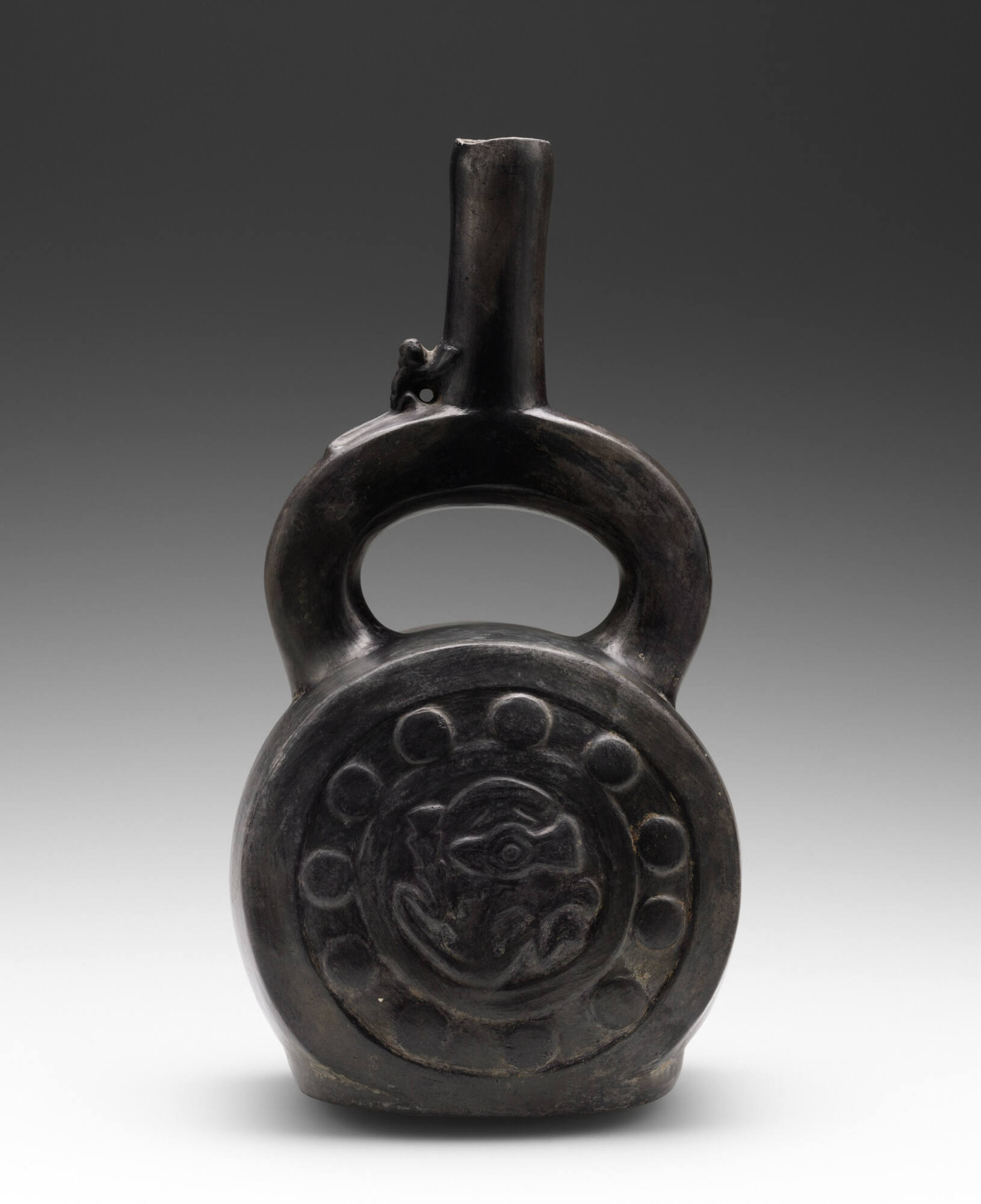 This Chimú burnished blackware stirrup-spout bottle has a mold-pressed decoration on the vessel body consisting of a round circle of dots surrounding a zoomorphic motif. The creature appears to be a fox, surmounted by the crescent-shaped headdress which served as an indicator of high status in both the Sicán and Chimú cultures of the Peruvian north coast. Foxes (Dusicyon culpaeus) are small predators, still found in the Andes. They are often associated with agriculture. During Inca times, fox-skin headdresses were worn by people guarding the agricultural fields.