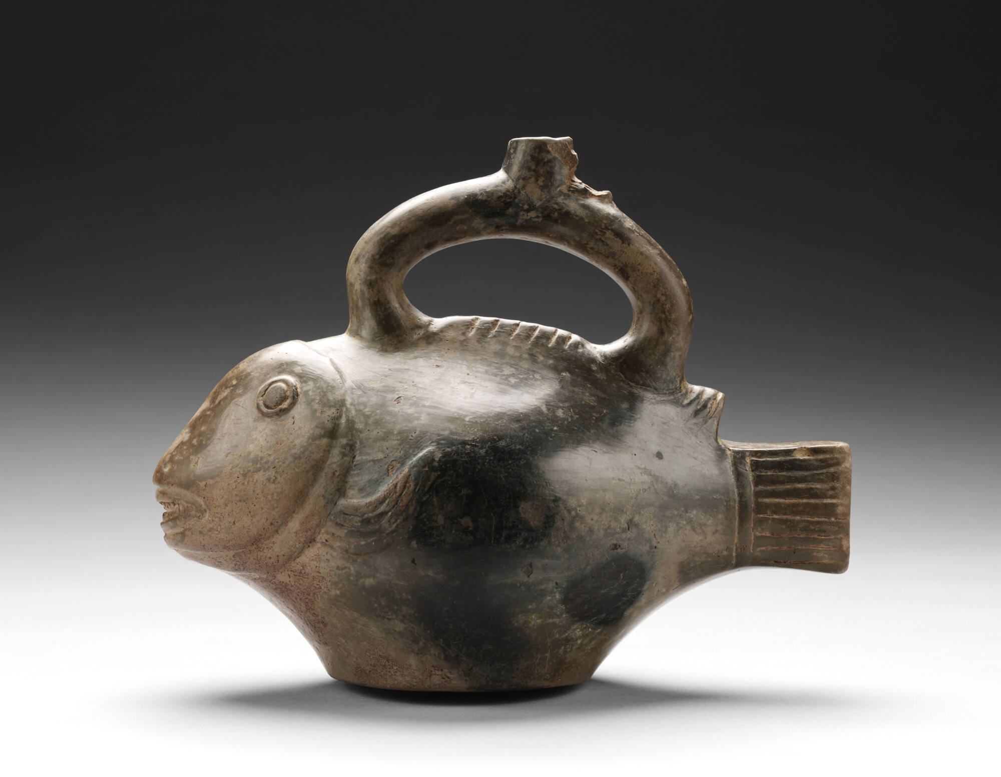 Chimú pots were made in a variety of forms including fish, humans, birds, lizards, vegetables and fruits, shells and other marine motifs. This pot is in the form of a fish. Notice the fin on the side of the fish, as well as the incised tail and the dorsal fin that connects to the stirrup-spout at the top. The fish has tiny nostrils, wide-open eyes, and a slightly opened mouth.