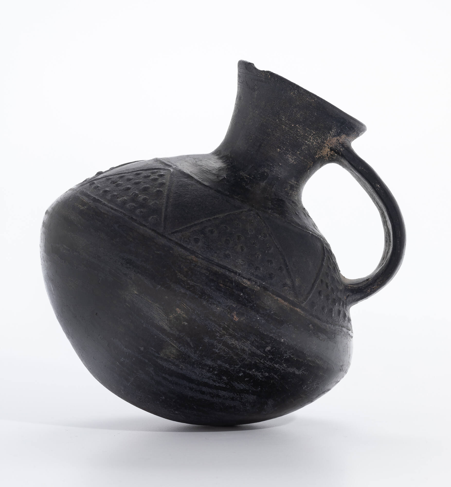This Chimu or Chimu-Inca burnished blackware pot has a strap-handle rounded base, a squat body, and a flaring spout. The vessel is decorated with a band of nested triangles; the lower ones are studded with dots, circling the vessel shoulders and giving the appearance of a medallion-like solar (inti) or floral motif when viewed from above.