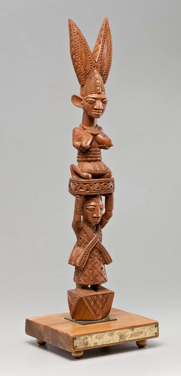 This carving depicts two figures, one on top of the other. Look at the figure on the bottom. He is wearing a patterned tunic and carrying two bags with long straps crossed at his chest. He may represent a babalawo, healers who often carry medicine bags. Notice that his arms are raised above his head supporting a platform, atop which a female figure kneels and holds her exposed breasts in her hands. This gesture is found elsewhere in Yoruba sculpture and signifies reverence and humility. She wears a patterned cloth around her waist and a necklace with a large pendant. Look at her headdress; what does it make you think of? While we may wonder about the significance of the two large pointed projections, their meaning is unknown.