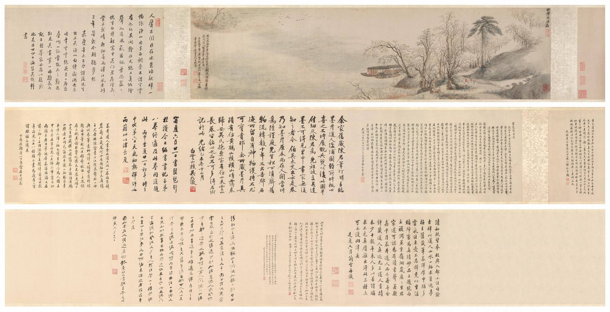 The subject of this short handscroll is taken from one the best-known poems of the famous Tang poet Bo Zhuyi. Composed in 816, the poem tells the tale of the exiled poet who late one autumn evening hears the sounds of the lute from a boat moored by the riverside and finds a former lady of the court, now married to a country merchant, playing songs on the lute that remind them both of their former years at the court. The age-old themes of loneliness, political exile, remoteness from civilized pleasures, along with the lyrical enchantment of an autumn evening with moonlight on a misty river, are described by Wu Li with understated elegance in this deft handling of a great poem. Among Wu Li’s distinctions was his conversion to Christianity, a rarity among Chinese painters, and in 1680 he was baptized under the name Simon Xavier. In 1681 he started out on a journey to Rome but got only as far as the Portuguese colony of Macao, where he remained for a number of years. This painting was done shortly after his arrival in Macao, and according to his inscription he did the painting Òthinking of the past.Ó Despite Wu Li’s exposure to Western works of art, this painting betrays no Western influence, and in this sense, in both subject matter and style, it is indeed a true tribute to the Chinese past. (From “A Handbook of the Collection: Herbert F. Johnson Museum of Art,” 1998)