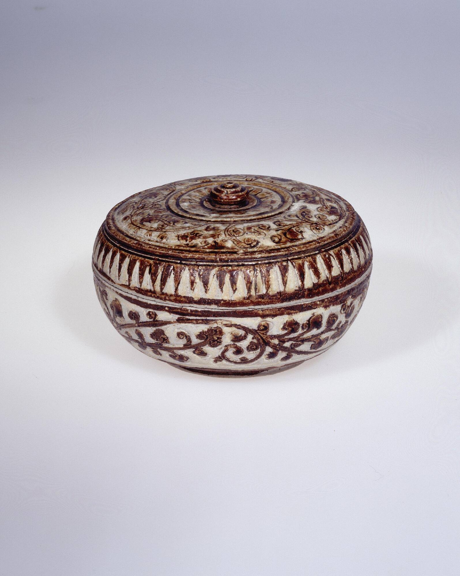 Of all the ceramics produced in Thailand, those from the Sawankhalok kilns have been found in the greatest numbers throughout Southeast Asia. This indicates they were produced for export rather than for domestic use. The export of Thai ceramics to other parts of Southeast Asia and beyond to the Arab world and Japan was at its peak in the fourteenth century, when Chinese wares were unavailable for export due to the disruption of the Mongol conquest. Hence the large numbers of Sawankhalok wares found in sites and shipwrecks in Malaysia and the Philippines. They were traditionally made of a high-fired coarse grey paste. This particular piece is part of a series of painted wares that have been found at different kiln sites. The ceramics were shaped, dried, painted in brown iron overglaze, and then fired. (From “A Handbook of the Collection: Herbert F. Johnson Museum of Art,” 1998)