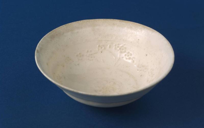 Stoneware with incised decorations in brown, and background in white, covered by a thin, transparent glaze