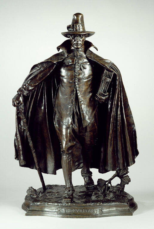 In 1881, Saint-Gaudens received a commission from Chester William Chapin, a congressman and business magnate, to create a bronze of his ancestor, Deacon Samuel Chapin (1595–1675), one of the founding fathers of Springfield, Massachusetts. Since no visual record of the Deacon existed, Saint-Gaudens chose to model the head of Chester Chapin’s son, theorizing “the Deacon must have had the same square jaw and beetling brows.” He also commissioned a re-creation of a set of Puritan clothing from drawings in the Chapin family. In his Reminiscences Saint-Gaudens wrote, “The statue . . . was to represent Deacon Samuel Chapin, but I developed it into an embodiment . . . of the Puritan.”In 1887, The Puritan was unveiled on Sterns Square in Springfield. It was moved in 1899 to its present location in Merrick Park. The monumental twelve-foot bronze, set on an impressive circular base, encapsulates the energy and fortitude of the Puritan colonists as well as the religious determination that brought them to this country. The statue was so popular that in 1898 a number of reduction bronzes were created by Saint-Gaudens and cast in Paris. Shown at the 1900 Exposition Universelle in Paris, the large-scale Puritan won the Grand Prix. It was exhibited to American audiences at the Louisiana Purchase Exposition in 1904. (“We Went to the Fair,” curated by Nancy E. Green and presented at the Johnson Museum August 27–December 18, 2016)