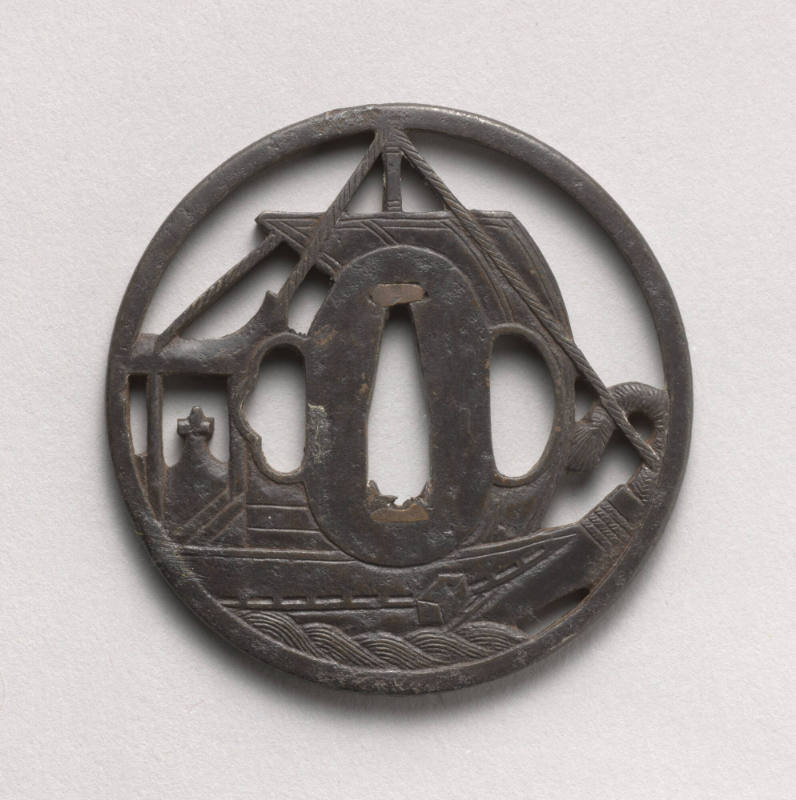 BRIEF DESCRIPTIONThis is a sword guard from a samurai sword.WHERE WAS IT MADE?This item was made in Japan.HOW WAS IT MADE?This tsuba was handcrafted from iron.HOW WAS IT USED?The tsuba, or sword guard, lies between the hilt and the blade of a samurai sword. The tsbua served to prevent the hand from sliding down the hilt and onto the blade during combat. It consists of an obverse (front) and reverse side. The obverse side is the one that would face the opponent, while the reverse side would come in contact with the hand of the user. For this reason, traditionally tsuba were kept smooth on the reverse side.WHY DOES IT LOOK LIKE THIS?During the peaceful Edo period, sword fittings were seldom created for swords that were to be used in battle. Instead, these fittings, such as the tsuba, became a medium for artistic work, appreciated for their exquisite workmanship, variety of designs, and refined beauty. Whereas until around the 1650s, only a small number of motifs were typically used to decorate the sword fittings, in the following years of the Edo period the artists who made these fittings took inspiration from images in books, characters in folktales, and other popular cultural and natural motifs. Swords and their fittings served as status items for samurai. A sword owner would select motifs that expressed his tastes, values and interests.Notice the figure in the lower left corner of the tsuba. Can you see that he is holding a shoe as he rides on the back of a dragon? This scene depicts a Taoist legend involving the historical figure Zhang Liang. Zhang Liang was a strategist and statesmen during the Han dynasty, and is known as one of the “Three Heroes” of the early Han dynasty. In the legend depicted here, he was crossing a bridge when an elderly traveler (a wise man named Huang Shigong—seen in the upper right corner on horseback) dropped his shoe into the river. Either by request, or of his own free will, Zhang Liang retrieved the shoe for the old man. He was eventually rewarded for his good deed with the gift of an important manuscript that Huang Shigong told him would prepare him to teach a king. This manuscript is said to have eventually reached Japan, where it was studied by Yoshitsune, a famous general during the 12th century. Notice the shape of the central hole of the tsuba; it permitted the blade of the sword to pass through. Frequently one or two secondary holes are seen on tsuba; these were made to accommodate other small sword fittings, the kozuka (a small utility knife) and the kogai (a small hairdressing tool shaped like a skewer.)