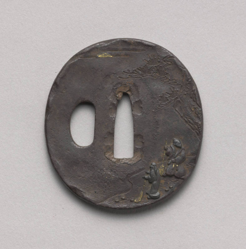BRIEF DESCRIPTIONThis is a sword guard from a samurai sword.WHERE WAS IT MADE?This item was made in Japan during the Edo period (1615-1868).HOW WAS IT MADE?This tsuba was handcrafted from a material known as shakudo, a copper-based alloy containing small amounts of gold and silver that can be polished to a deep shiny blue or blue-black. The designs were created with a combination of high-relief carving, engraving, and gold inlay.HOW WAS IT USED?The tsuba, or sword guard, lies between the hilt and the blade of a samurai sword. The tsbua served to prevent the hand from sliding down the hilt and onto the blade during combat. It consists of an obverse (front) and reverse side. The obverse side is the one that would face the opponent, while the reverse side would come in contact with the hand of the user. For this reason, traditionally tsuba were kept smooth on the reverse side.WHY DOES IT LOOK LIKE THIS?During the peaceful Edo period, sword fittings were seldom created for swords that were to be used in battle. Instead, these fittings, such as the tsuba, became a medium for artistic work, appreciated for their exquisite workmanship, variety of designs, and refined beauty. Whereas until around the 1650s, only a small number of motifs were typically used to decorate the sword fittings, in the following years of the Edo period the artists who made these fittings took inspiration from images in books, characters in folktales, and other popular cultural and natural motifs. Swords and their fittings served as status items for samurai. A sword owner would select motifs that expressed his tastes, values and interests. This particular tsuba features the design of a tiger.Notice the shape of the central hole of the tsuba; it permitted the blade of the sword to pass through. Frequently one or two secondary holes are seen on tsuba; these were made to accommodate other small sword fittings, the kozuka (a small utility knife) and the kogai (a small hairdressing tool shaped like a skewer.)