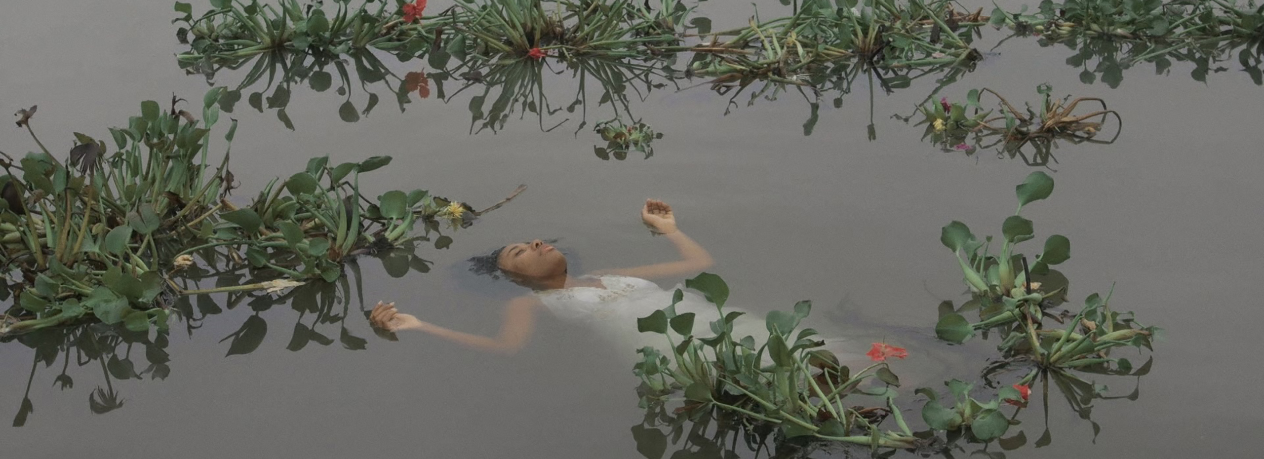 A Black woman in a white dress floats in a body of water full of flowers