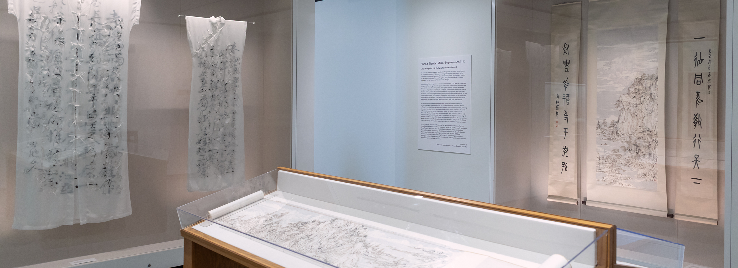 Mirror Impressions considers dialogues between art and nature, the ancient and the contemporary, and, more philosophically, the traces of personal life and history that are reflected in the mind. Recent works highlight several of Wang’s artistic approaches, including landscapes combined with ink rubbings or hung with actual historic works from the artist’s collection; silk robes burned with Ming-dynasty poems; and plaster sculptures made from molds of ancient Chinese tomb figurines. Each work of art consists of additions and subtractions through which the artist seeks a philosophical and religious understanding—for example, the different colors of the plaster figurines’ bases signify traces of human activities and an individual’s karma. For the artist, this mirroring becomes a metaphor for the Chinese Chan (Zen) concept of the Buddha nature that reflects, but does not change or participate.